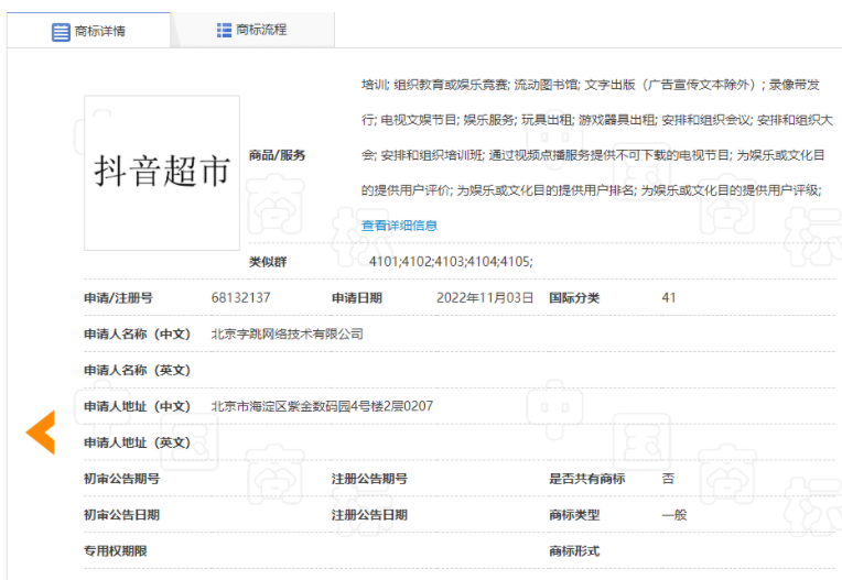 據(jù)國家知識產(chǎn)權(quán)局中國商標(biāo)網(wǎng),北京字跳網(wǎng)絡(luò)技術(shù)有限公司近日申請注冊“抖音超市”商標(biāo),國際分類為廣告銷售、教育娛樂,當(dāng)前商標(biāo)進(jìn)度均為申請中。