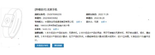 11 月 29 日消息,據(jù)國家知識產(chǎn)權(quán)局中國專利公布公告(授權(quán)公告號:CN307698623S)顯示中國聯(lián)合網(wǎng)絡(luò)通信集團(tuán)有限公司申請的“無屏手機(jī)”外觀設(shè)計(jì)專利獲授權(quán)并公布。