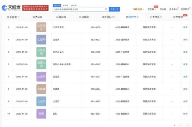 天眼查App顯示,近日,北京證券交易所有限責任公司申請注冊多個“北京證券交易所 BEIJING STOCK EXCHANGE”“北京證交所”“ 北證所”商標,國際分類包括通訊服務、教育娛樂等,目前商標狀態(tài)均為申請中。