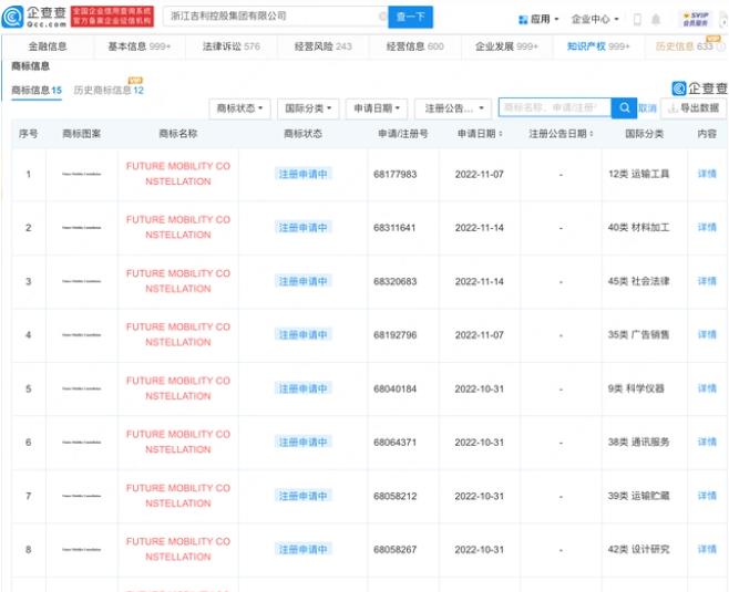 企查查APP顯示,近日,浙江吉利控股集團有限公司申請注冊多枚“FUTURE MOBILITY CONSTELLATION”商標,國際分類涉及社會法律、運輸工具等,當前商標狀態(tài)多為注冊申請中。