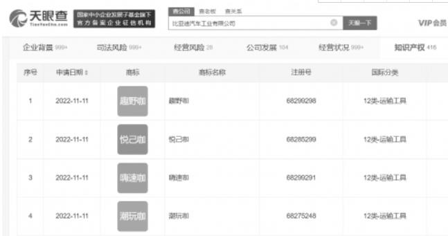 天眼查App顯示,近日,比亞迪汽車工業(yè)有限公司申請注冊“趣野咖”“悅己咖”“嗨速咖”“潮玩咖”商標,國際分類均為運輸工具,商標狀態(tài)均為申請中。