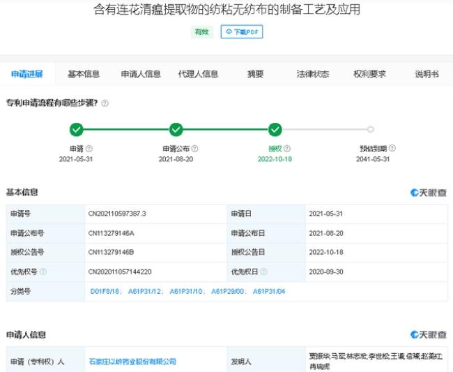 天眼查App顯示,近日,石家莊以嶺藥業(yè)股份有限公司申請的“含有連花清瘟提取物的紡粘無紡布的制備工藝及應用”專利獲授權。