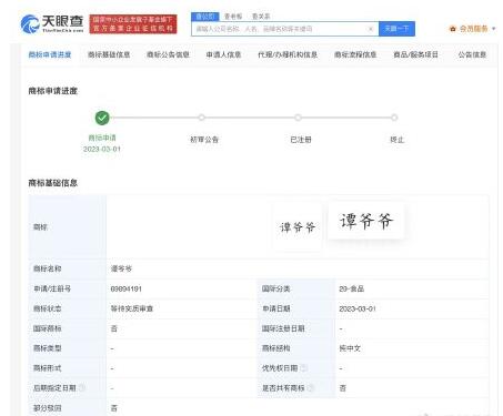 天眼查App顯示,今年2月、3月,成都大熊貓繁育研究基地全資持股的成都國之瑰寶文化旅游有限公司已申請注冊多個“譚爺爺”商標(biāo),國際分類包括餐飲住宿、珠寶鐘表等,目前商標(biāo)狀態(tài)均為申請中。