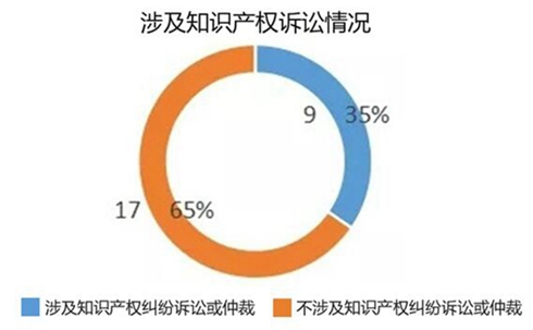 統(tǒng)計發(fā)現(xiàn),在以上26家涉及訴訟或仲裁的企業(yè)中,涉及知識產(chǎn)權(quán)糾紛方面相關(guān)的訴訟共有9家,占26家涉訴企業(yè)的35%,占76家企業(yè)總數(shù)的12%。