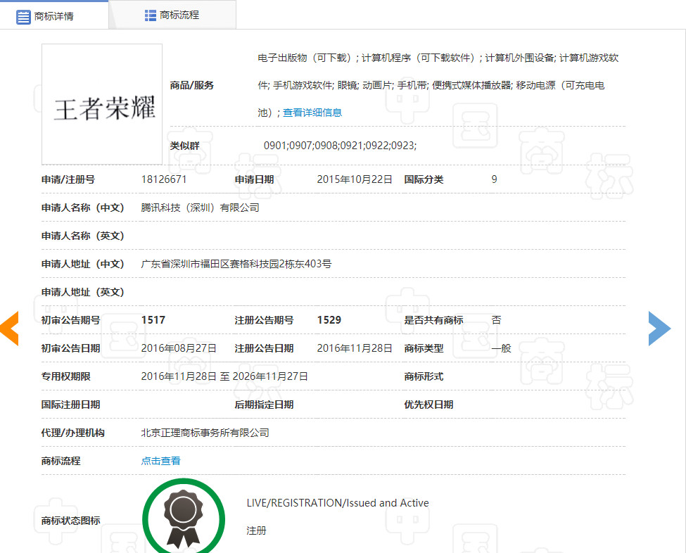 2018年6月19日,騰訊公司以侵犯其在先著作權(quán)為由,向原國(guó)家工商行政管理總局商標(biāo)評(píng)審委員(下稱原商評(píng)委)會(huì)對(duì)上述商標(biāo)提出無(wú)效宣告請(qǐng)求,其認(rèn)為訴爭(zhēng)商標(biāo)與騰訊公司的第18126671號(hào)“王者榮耀”商標(biāo)(下稱引證商標(biāo))構(gòu)成使用在類似商品上的近似商標(biāo),易使公眾誤認(rèn),依據(jù)商標(biāo)法第七條、第十條第一款第(七)項(xiàng)、第三十條、第三十二條以及第四十四條之規(guī)定,請(qǐng)求對(duì)訴爭(zhēng)商標(biāo)予以無(wú)效宣告。據(jù)查,引證商標(biāo)于2015年10月22日申請(qǐng)注冊(cè),2016年11月28日被核準(zhǔn)注冊(cè)使用在電子出版物(可下載)、 計(jì)算機(jī)程序(可下載軟件)、 計(jì)算機(jī)外圍設(shè)備等第9類商品上。