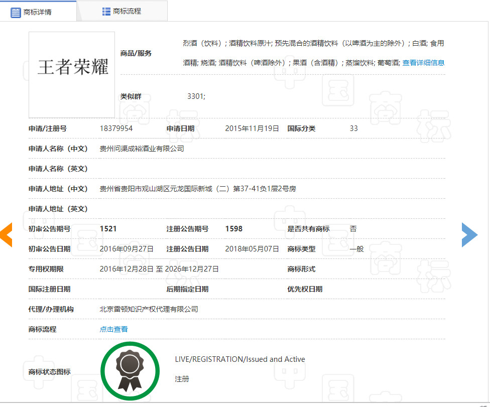 2015年11月19日,貴州問(wèn)渠成裕酒業(yè)有限公司(下稱問(wèn)渠酒業(yè))申請(qǐng)注冊(cè)第18379954號(hào)“王者榮耀”商標(biāo)(下稱訴爭(zhēng)商標(biāo)),指定使用在第33類烈酒(飲料)、燒酒、酒精飲料(啤酒除外)、果酒(含酒精)等商品上,期間商標(biāo)被提起異議,不過(guò)最終于2018年5月7日被核準(zhǔn)注冊(cè)。
